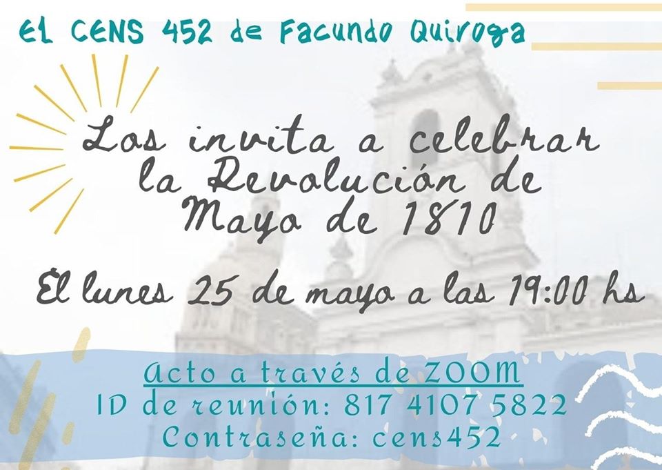 El Centro Educativo de Nivel Secundario – CENS 452 – de Facundo Quiroga, conocido como secundario de adultos y que funciona en turno nocturno en la Escuela N° 13, convoca a celebrar el 25 de Mayo.