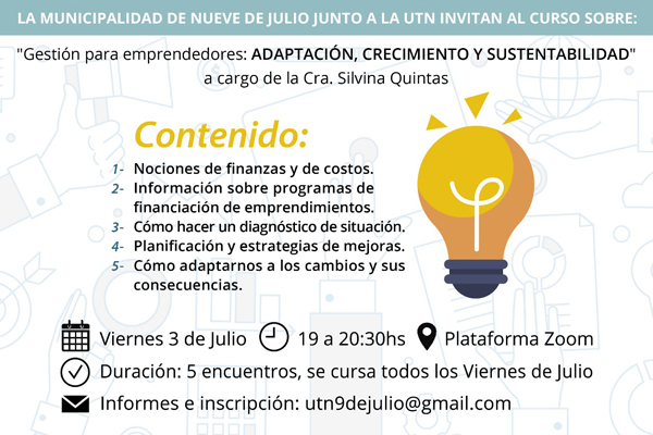 La Dirección de Educación de la Municipalidad de Nueve de Julio, a través de la sede San Nicolás de la Universidad Tecnológica Nacional (UTN), invita a los interesados a sumarse al curso “Gestión para emprendedores: Adaptación, crecimiento y sustentabilidad”, que abordará aspectos de cómo adaptarnos a los cambios y sus consecuencias; cómo hacer un diagnóstico de situación, planificación y estrategias de mejoras; nociones de finanzas y costos e información sobre programas de financiación de emprendimientos.