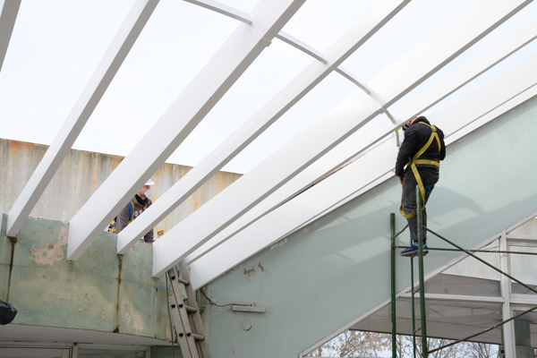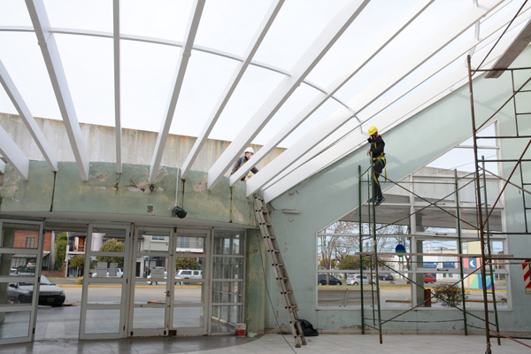 La Municipalidad de Nueve de Julio, a través de la Secretaría de Urbanismo y Vivienda, avanza en las obras de recambio completo del techo de policarbonato del hall central de la Terminal de Omnibus, tarea que comprende además el mantenimiento general de la totalidad de la estructura metálica del mismo, tanto en el interior como en el exterior, la que se encontraba visiblemente deteriorada y originaba importantes filtraciones.