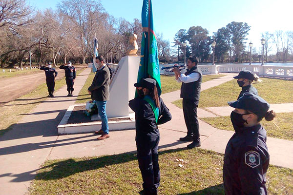 Tras el Izamiento de Banderas en Plaza Belgrano a cargo de inspectores de Tránsito, a las 10,30 hs. se realizó el acto con la presencia del Intendente, la Presidente del HCD, abanderados y escoltas de la Policía Comunal, en el Parque Gral. San Martín.