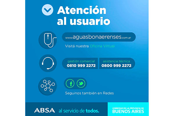 Además de la página web, los usuarios de ABSA pueden comunicarse con la empresa a los teléfonos: 0810 999 2272 para cuestiones comerciales, 0800 999 2272 para temas operativos. O vía mensajes privados en las redes sociales oficiales: Twitter: @ABSAOficial Facebook: @AguasBonaerensesSA.