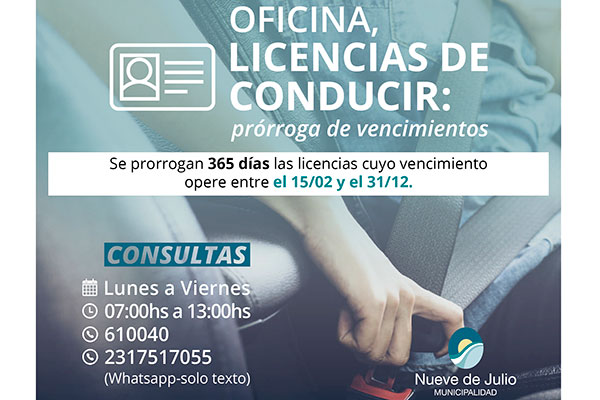 La Oficina de Licencias de Conducir de la Municipalidad de Nueve de Julio informa que se han prorrogado por 365 días corridos los vencimientos de las licencias de conducir que hayan operado u operen entre el 15 de febrero y el 31 de Diciembre (Art. 1-Disp. 34/2020 de la DPPSV).