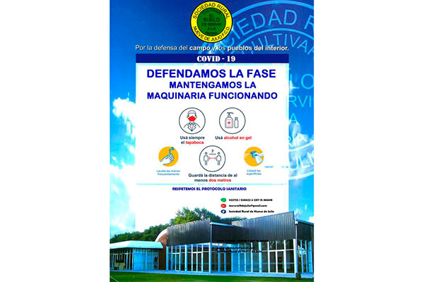 Sociedad Rural de  Nueve de Julio es una de las instituciones de bien público que el pasado martes  20 participó de una convocatoria realizada por Rotary Club a tener un mensaje común entre la comunidad de  9 de Julio, llamando a transitar una Conciencia Social contra el covid-19.