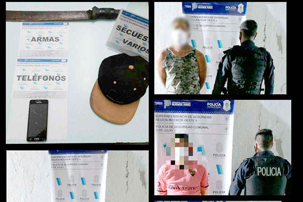 Posteriormente, al realizar un operativo cerrojo personal policial que recorría la zona juntamente con personal del GTO de la Estación de Policía y SUB DDI Bragado, en inmediaciones del lugar, procedió a la aprehensión de uno de los autores del hecho, un masculino de 31 años de edad, domiciliado en calle Perón al 2700, un segundo sujeto masculino de 35 años, domiciliado en Roca y Cavallari y un tercer sujeto masculino de 20 años, domiciliado en Sarmiento y Alberdi, procediéndose a la incautación del motovehículo en que se desplazaban, una unidad Corven 110 Energy de color azul, encontrándose en el interior de la misma, la gorra sustraída, a la vez que se incautó un machete en la intersección de calles J. B. González y Avellaneda, arma con la cual produjeron la lesión al denunciante, y el teléfono sustraído a la víctima.