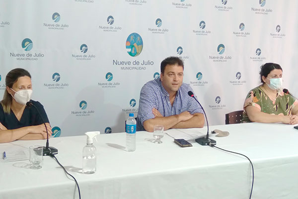 El Intendente Municipal de Nueve de Julio, Mariano Barroso, acompañado de la Secretaria de Salud, Dra. Lucía Pirotta; y de la presidente del H. Concejo Deliberante, María José Gentile, brindó pasado el mediodía de ayer una importante conferencia de prensa en la que anunció la aplicación de restricciones –que entrarán en vigencia desde la medianoche de hoy-, en el contexto de la pandemia de Covid-19 y el alto número de casos registrados en el distrito en los últimos días.