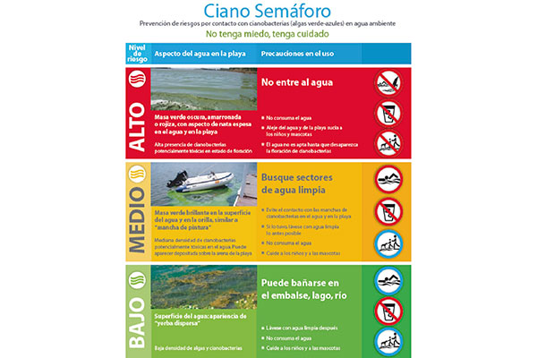 Asimismo, adelantó que se habrá de disponer un “semáforo” cinobacteriológico que irá indicando con sus colores la mayor o menor presencia de estos elementos y su peligrosidad.
