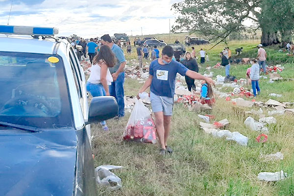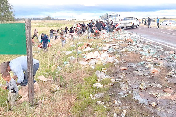 Un momento insólito tuvo lugar este miércoles en la Ruta Provincial 65 a la altura del paraje “Los Cuatro Vientos”, en el vecino partido de Bolívar, cuando un camión que transportaba cerveza volcara parte de su carga en la cinta asfáltica. Al poco tiempo de producirse el episodio, un grupo de personas se acercó al lugar y comenzó a llevarse el producto caído.