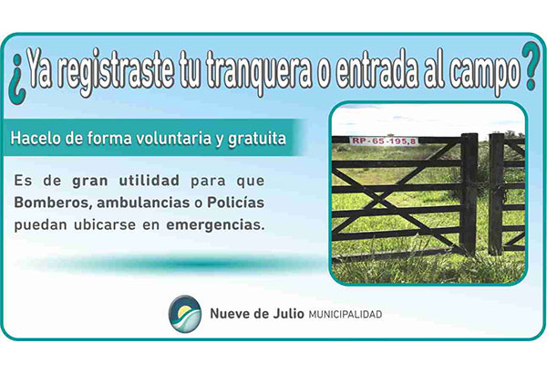 La Municipalidad de Nueve de Julio, a través de la Subsecretaría de Producción, continúa desarrollando el sistema para establecer la nomenclatura de caminos rurales del distrito, y en este contexto, permitir la ubicación de las distintas tranqueras, a fin de determinar el acceso a cada campo.