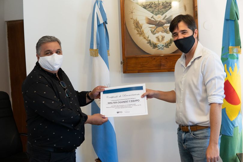 El intendente municipal hizo entrega de un reconocimiento a Walter Ogando y equipo por su reciente nominación a los premios Martín Fierro del Interior, por el programa “Somos el Campo” que se emite en Radio Viamonte 88.1 de Los Toldos.