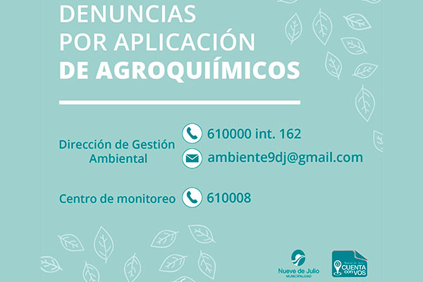 La Municipalidad de Nueve de Julio, a través de la Dirección de Gestión Ambiental, comunica que, ante denuncias por aplicación de agroquímicos, también podrán comunicarse al Centro de Monitoreo, Teléfono 610008, las 24 horas, todos los días de la semana.