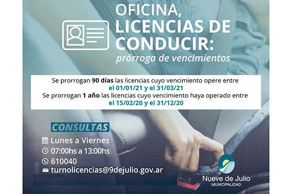 La Oficina de Licencias de Conducir de la Municipalidad de Nueve de Julio informa que se han prorrogado por 90 días las licencias de conducir que hayan operado u operen entre el 01 de enero de 2021 y el 31 de marzo del 2021.