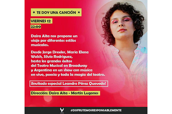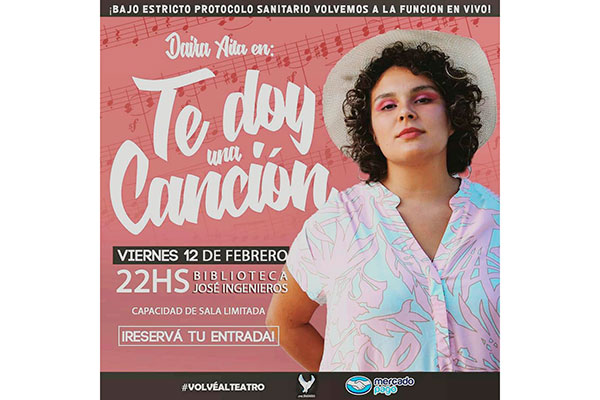 Esta noche, desde las 22 hs., en la Biblioteca José Ingenieros, con modalidad presencial y cumpliendo todos los protocolos vigentes, se habrá de presentar el espectáculo musical “Te doy una canción”, de Daira Aita, quien habrá de recorrer un variado repertorio de artistas populares y clásicos de Brodway, con la participación de Leandro Pérez Quevedo y la producción de Martín Lugones.