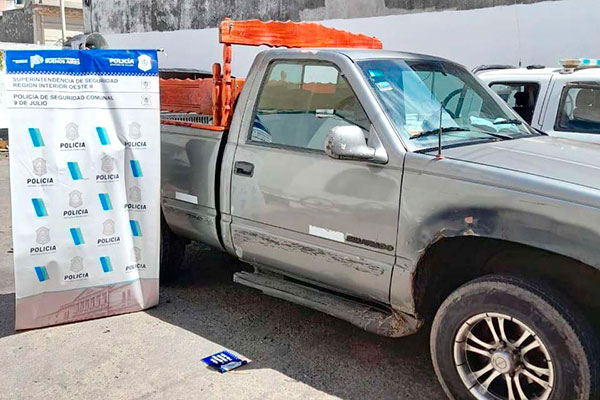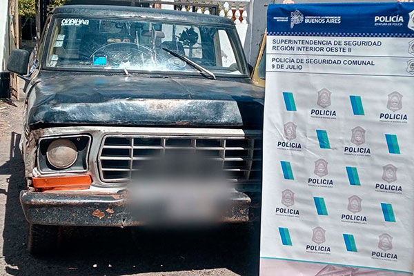 La Estación de Policía Comunal de 9 de Julio informó que en el mediodía de ayer, personal de la dependencia procedió, en calles Marinero Arce y Rafael Obligado de este medio a la interceptación de una camioneta Ford F-100 despintada, conducida por un masculino de 18 años, y a quien acompañaba otro masculino de 16 años; y una camioneta Chevrolet Silverado, color gris, conducida por masculino de 37 años, acompañado por un menor de 14, todos oriundos de la localidad de Merlo, Provincia de Buenos Aires.