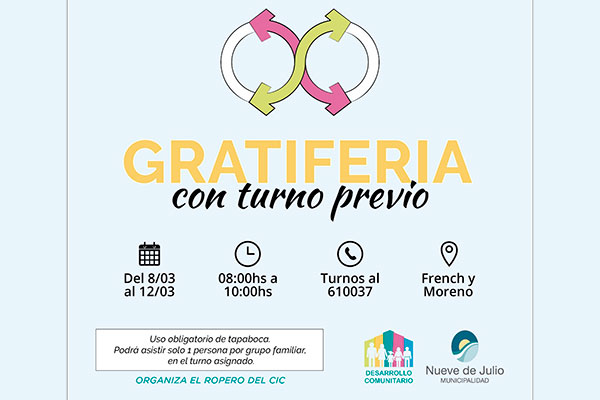 La Secretaría de Desarrollo Comunitario de la Municipalidad de Nueve de Julio, invita a todos los vecinos a participar de la “Gratiferia” organizada por el Ropero Comunitario del CIC, la que se desarrollará en la semana del 8 al 12 de marzo, de 8 a 10 hs.