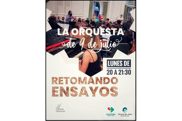 La Orquesta Escuela de la Municipalidad de Nueve de Julio, reiniciará el próximo lunes 15 de marzo, de 20 a 21,30 hs., en el Salón Blanco Municipal, sus actividades libres y gratuitas del presente año; continuando todos los lunes en el mismo horario.