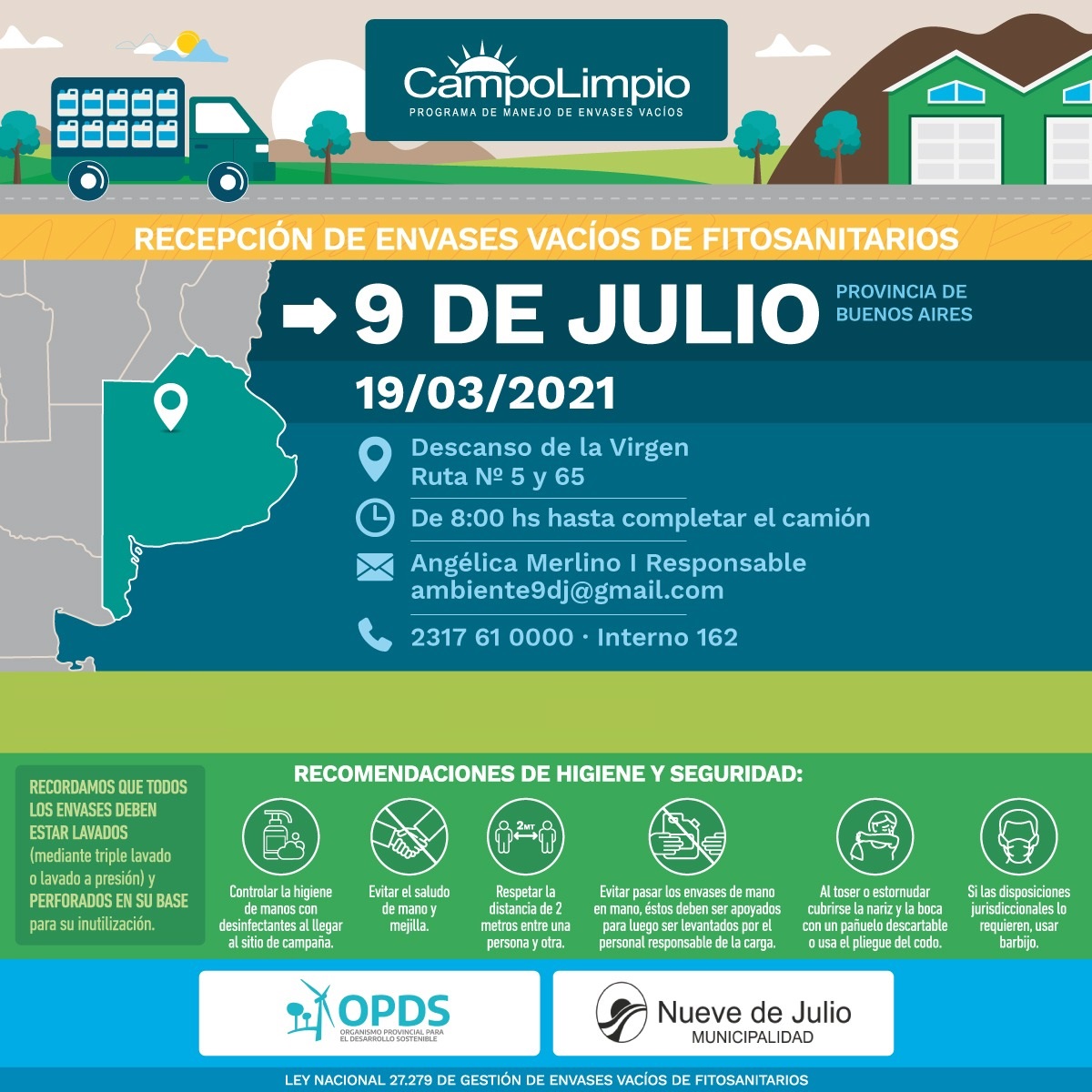La Dirección de Gestión Ambiental de la Municipalidad de Nueve de Julio desarrollará el día viernes 19 del corriente mes de marzo, una nueva jornada de recolección de envases vacíos de agroquímicos, la que se llevará a cabo en el sitio conocido como “Descanso de la Virgen”, sobre Ruta Provincial Nro. 65.