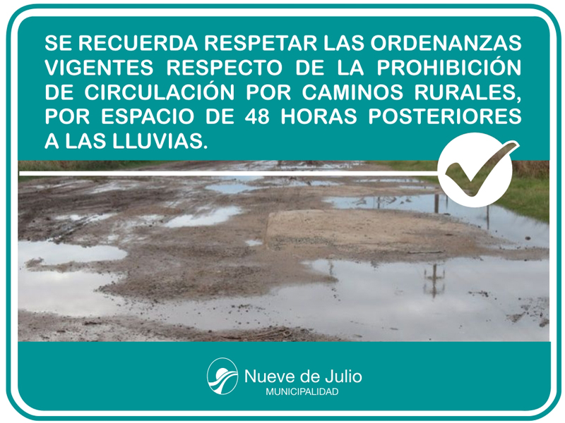 La Municipalidad de Nueve de Julio, a través de la Secretaría de Obras y Servicios Públicos, solicita a productores agropecuarios, acopiadores, transportistas y vecinos en general, recordar y respetar las ordenanzas vigentes respecto de la prohibición de circulación por caminos rurales con cargas, por espacio de 48 horas posteriores a las lluvias, así como la cumplimentación de las disposiciones vigentes respecto de la capacidad de cargas.