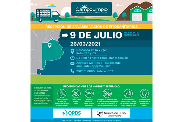 La Dirección de Gestión Ambiental de la Municipalidad de Nueve de Julio desarrollará el día viernes 26 del corriente mes de marzo, una nueva jornada de recolección de envases vacíos de agroquímicos, la que se llevará a cabo en el sitio conocido como “Descanso de la Virgen”, sobre Ruta Provincial Nro. 65; instancia que se concreta por segunda vez en el presente mes, luego del trabajo realizado el día 19, donde se recolectaron más de 2.700 bidones; mientras que para esta oportunidad ya hay más de 3.000 registrados.
