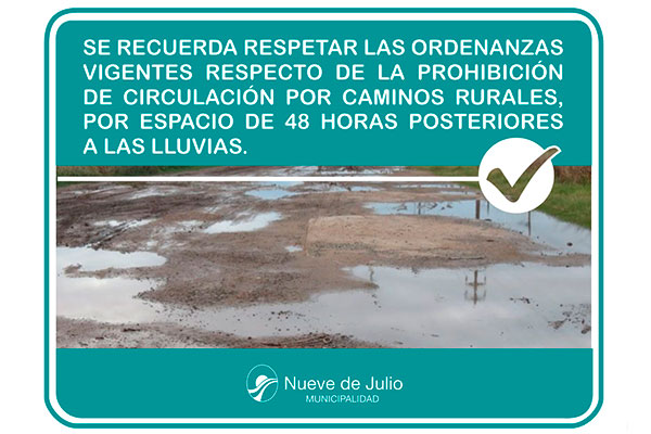 La Municipalidad de Nueve de Julio, a través de la Secretaría de Obras y Servicios Públicos, solicita a productores agropecuarios, acopiadores, transportistas y vecinos en general, recordar y respetar las ordenanzas vigentes respecto de la prohibición de circulación por caminos rurales con cargas, por espacio de 48 horas posteriores a las lluvias, así como la cumplimentación de las disposiciones vigentes respecto de la capacidad de cargas.
