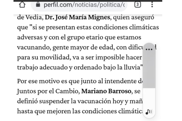 La Municipalidad de Nueve de Julio desmiente enérgicamente las afirmaciones vertidas en el Diario Perfil por parte del Coordinador de Vacunación y Director Médico Asociado del Hospital “Julio de Vedia”, Dr. José María Mignes, quien señaló que la decisión de suspender hasta el lunes la vacunación contra el Covid-19 ante la amenaza de lluvias fue tomada en forma conjunta con el Intendente Municipal, Mariano Barroso.