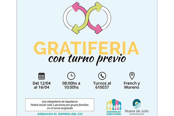 La Secretaría de Desarrollo Comunitario de la Municipalidad de Nueve de Julio, invita a todos los vecinos a participar de la “Gratiferia” organizada por el Ropero Comunitario del CIC, la que se desarrollará entre hoy y el viernes 16 del corriente, de 8 a 10 hs.