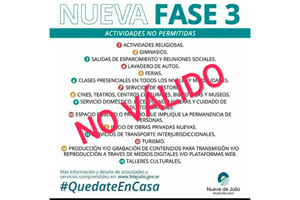 La municipalidad de 9 de julio informa que el municipio sigue en la Fase 4 de la Administración del Aislamiento y Distanciamiento Social Preventivo y Obligatorio, hasta que el Gobierno de la Provincia de Buenos Aires disponga alguna modificación, que en caso de ocurrir, sería recién a comienzos de la próxima semana.