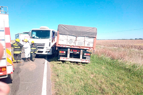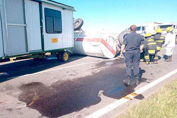 Conforme explicaron desde el Cuerpo de Bomberos Voluntarios de Dudignac, un camión de los denominados “piedreros” colisionó la parte trasera de la casilla, por lo que se produjo el vuelco el tanque de combustible, derramando gasoil; lo que provocó que el transporte y su acoplado hicieran un efecto tijera.