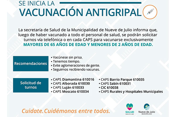 La Municipalidad de Nueve de Julio, a través de la Secretaría de Salud, informa que desde hoy, lunes 19 se habrá de iniciar la campaña de vacunación antigripal 2021.