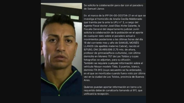 Desde la Fiscalía confirmaron que en horas de esta mañana, encontraron el cadáver de Analía Maldonado en un camino vecinal que conduce a la localidad de San Emilio. En este momento se realizan trabajos en el lugar y se intensifica la búsqueda de su pareja, Samuel Llanos, que se encuentra prófugo. El padre de la mujer realizó la denuncia de la desaparición de la pareja en horas del mediodía del lunes, por que la Policía local inició un intenso rastrillaje para dar con el paradero de ambos convivientes. En tanto, vecinos de la pareja habían señalado que se escuchó una discusión en la casa que habitaba horas antes de la desaparición y trascendió que se hallaron rastros de sangre en la casa. De acuerdo a la información difundida por Fiscalía, se estima que la pareja podría circular en un automóvil Nissan de color blanco, con patente ITA 913.