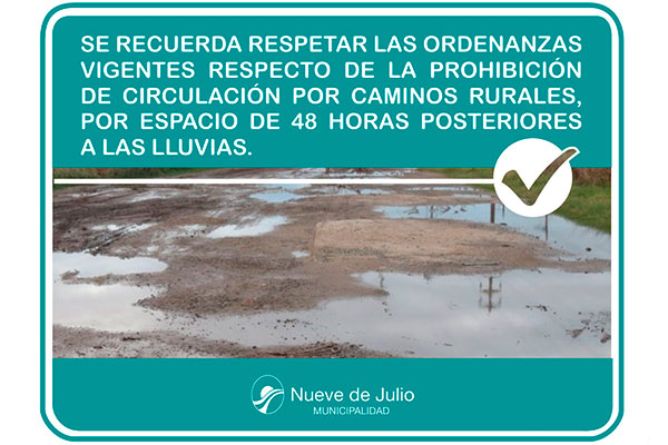 La Municipalidad de Nueve de Julio, a través de la Secretaría de Obras y Servicios Públicos, solicita a productores agropecuarios, acopiadores, transportistas y vecinos en general, recordar y respetar las ordenanzas vigentes respecto de la prohibición de circulación por caminos rurales con cargas, por espacio de 48 horas posteriores a las lluvias, así como la cumplimentación de las disposiciones vigentes respecto de la capacidad de cargas.