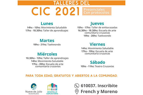 La municipalidad de 9 de Julio, a través de la Secretaría de Desarrollo Comunitario invita a los vecinos a participar de las distintas actividades que se llevan adelante en el Centro Integrador Comunitario”MartinCallegaro”.