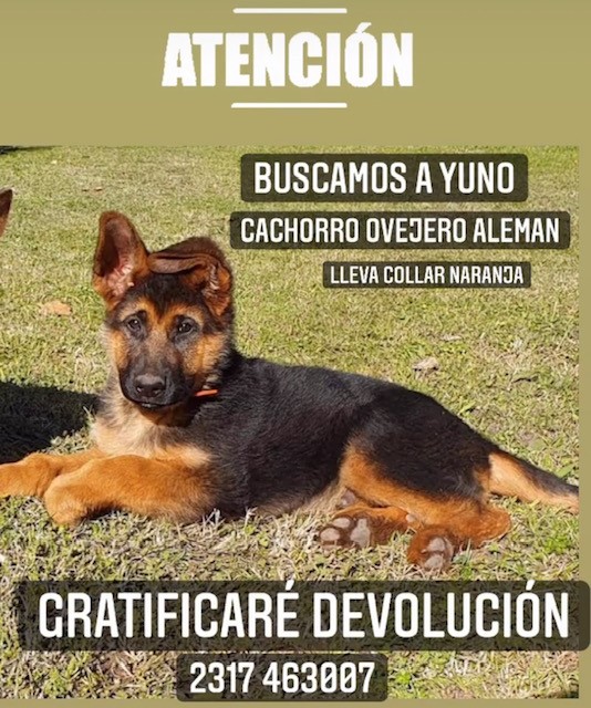 Se perdió Yuno. Es un cachorro de ovejero alemán y tiene collar naranja. Se gratificara su devolución.