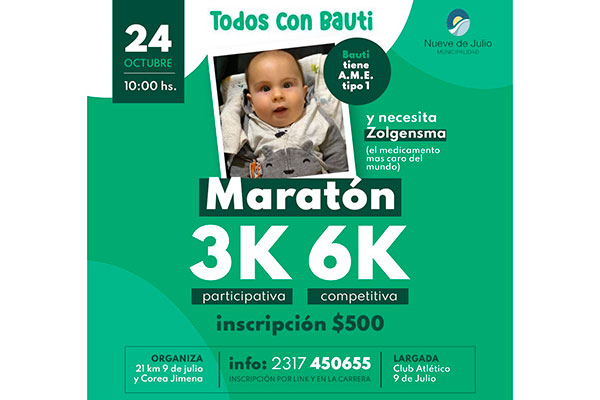 El día domingo 24 de octubre, desde las 10 de la mañana, con largada en el Club Atlético 9 de Julio se llevará adelante una carrera de 6 y 3 kilómetros destinada a recaudar fondos para y colaborar con la campaña “Todos con Bauti”.