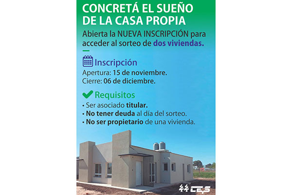 La CEyS “M. Moreno” Ltda. comunica a sus asociados que se encuentra abierta la inscripción para acceder al sorteo de dos (2) viviendas cooperativas. El Consejo de Administración siente un gran orgullo del primer proyecto de viviendas que busca darle la posibilidad a nuestros vecinos de acceder a una casa propia.