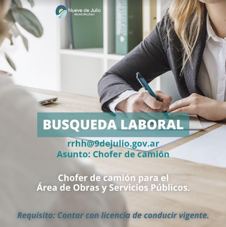 La Dirección General de Recursos Humanos de la Municipalidad de Nueve de Julio se encuentra desarrollando una búsqueda laboral de chofer de camión, para el área de Obras y Servicios Publicos. Los interesados deberán enviar su curriculum al mail [email protected], con el asunto chifer de camión. Es requisito indispensable contar con licencia de conducir vigente.