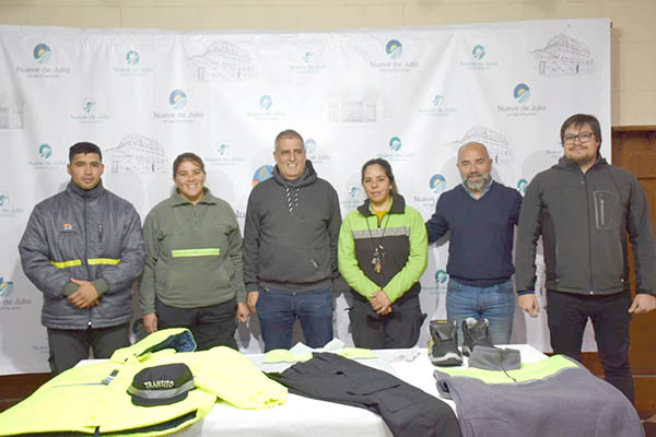La Municipalidad de Nueve de Julio adquirió recientemente nueva indumentaria para el personal de diferentes áreas, que fue entregada de manera simbólica el viernes a los trabajadores. Se trata una importante remesa de camperas, buzos, chalecos, chombas, camisas y pantalones de trabajo y borceguíes, que está destinada -de acuerdo a las necesidades de cada sector-, a inspectores de Tránsito, a operarios del Sistema de Estacionamiento Medido (SEM) y a personal del sector de Demarcación Vial.