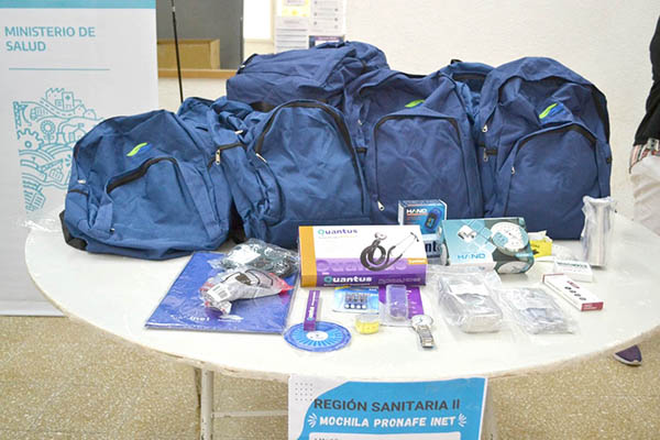Por su parte, el licenciado Diego Vicente explicó que cada mochila posee 18 elementos. Están dirigidas a estudiantes del segundo año de la carrera de enfermería, lo que se complementa con las becas y la capacitación de docentes y alumnos mediante una plataforma virtual.