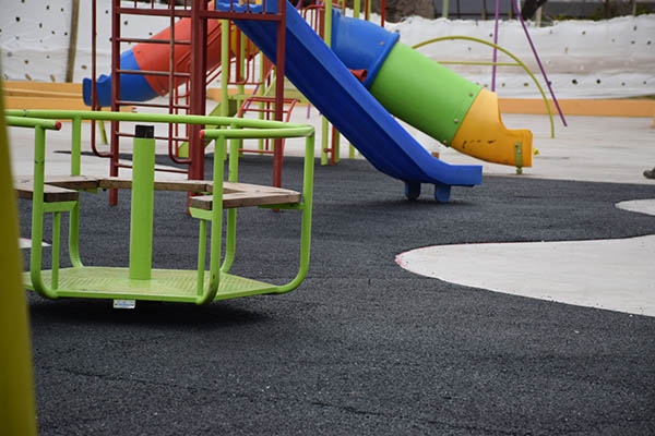 Durante la semana la Municipalidad de Nueve de Julio, a través de la Secretaría de Obras y Servicios Públicos, comenzó a colocar la base de la superficie de seguridad de caucho reciclado que se instalará en el sector de juegos de Plaza España.
