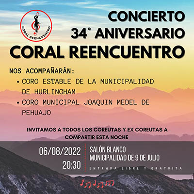 Coral Reencuentro prepara el concierto conmemorativo de su 34º Aniversario, el que se habrá de desarrollar el próximo sábado 6, en el Salón Blanco municipal, con entrada libre y gratuita.