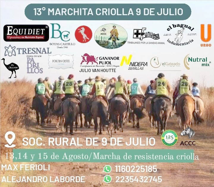 Los caminos rurales del partido, recibirán el 12, 13, 14 y 15 de ag osto una“Marchita de caballos criollos”, evento avalado por la Asociación Argentina de Caballos Criollos, que cerrará las actividades de la misma para el presente año.