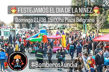 Los Bomberos Voluntarios festejarán el Día de la Niñez como es ya tradición, frente al Palacio municipal. Será el domingo 21 de agosto entre las 15 y 16 hs.
