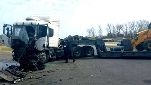 Por causas que tratan de establecer un camión – que arrastraba un carretón que llevaba una pala retroexcavadora- y que iba guiado por Miguel Angel Farías, de 53 años -domiciliado en la localidad de Alberti-, chocó con un Scania, que arrastraba un semirremolque cargado de productos alimenticios. Este iba conducido por Angel Emanuel Urtubia, de 32 años de edad y oriundo de Rivadavia (provincia de Mendoza).