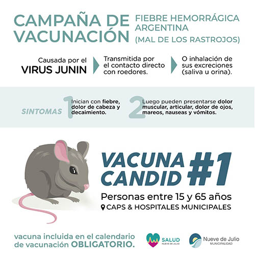 La Secretaría municipal de Salud informa que continúa la campaña de vacunación contra la Fiebre Hemorrágica Argentina (Mal de los Rastrojos), causada por el virus Junín, y transmitida por el contacto directo con roedores o inhalación de sus excreciones (saliva u orina).