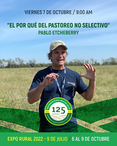 En paralelo con el ingreso de los animales para el Concurso de Novillos, el día viernes 7, a la hora 9 se desarrollará una charla con un destacado expositor como es Pablo Etcheberry, quien viene trabajando y capacitando, todo en lo que refiere a “Ganadería regenerativa”.