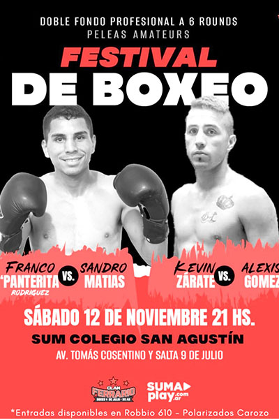 Este sábado 12 de noviembre, el gimnasio de boxeo “Clan Ferrario”, llevará adelante una nueva y atractiva velada de boxeo con dos combates de fondo profesional a 6 rounds y combates amateurs. Será en el gimnasio del Colegio San Agustín a partir de las 21 hs.