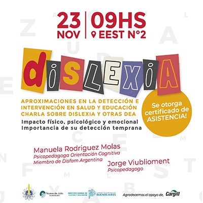 Con la organización de distintas ONGs e instituciones de la comunidad y el apoyo de la de la Municipalidad de Nueve de Julio, se desarrollará, el próximo miércoles 23 del corriente, desde las 9,00 y en las instalaciones de la Escuela de Educación Secundaria Técnica Nº 2; una interesante jornada sobre dislexia.
