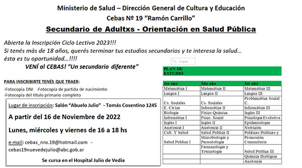 Está abierta la inscripción a 1er año del bachillerato de adultos para el ciclo lectivo 2023 del CEBAS Nº 19 "Ramón Carrillo". Este es un secundario de adultos con orientación en Salud Pública, que funciona desde el año 2015 en el Hospital Julio de Vedia y es abierto a la comunidad en general. Especialmente está dirigido a todos los agentes que se desempeñan en el sistema de salud que no han concluido sus estudios secundarios.