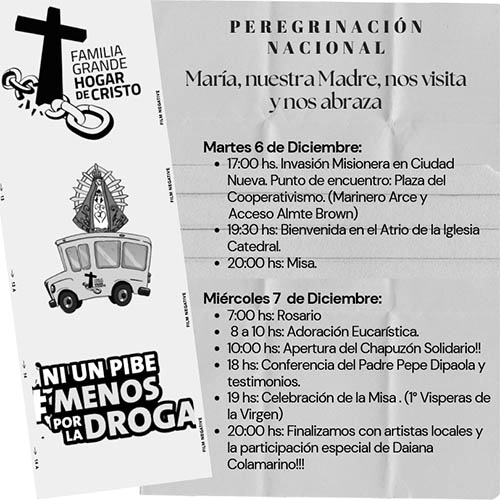 ofreceremos una conferencia donde el Padre Pepe, creador de los Hogares de Cristo, nos compartirá cómo prevenir y acompañar estas situaciones complejas de nuestra realidad. A las 19:00 horas celebraremos la Misa en la Plaza, festejando las primeras vísperas de la Inmaculada Concepción y agradeciendo a Dios por el paso de esta Peregrinación por nuestra Ciudad. Y para finalizar toda esta movida, también tendremos la alegría de compartir algunos talentos de nuestra