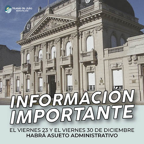 A través del Decreto 2297, el Intendente Municipal de Nueve de Julio, Mariano Barroso, dispuso la adhesión del Gobierno Municipal al Decreto 2022-820-APN-PTE. del Ejecutivo Nacional, y a través del cual se establece asueto administrativo para la administración pública para las jornadas de los viernes 23 y 30 del corriente, en las vísperas de las celebraciones de Navidad y Año Nuevo.