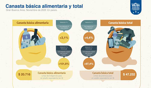 En resultado, el informe del INDEC “Valorización mensual de la CBA y de la CBT. Gran Buenos Aires” indicó que las variaciones interanuales de la Canasta Alimentaria y de la Canasta Básica Total tuvieron un alza de 101,8 % y 97,4%, respectivamente.
